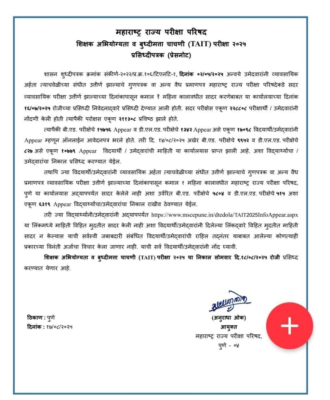 शिक्षक अभियोग्यता व बुध्दीमत्ता चाचणी (TAIT) परीक्षा २०२५ चा निकाल सोमवार दि. १८/०८/२०२५ रोजी प्रसिध्द करण्यात येणार आहे.